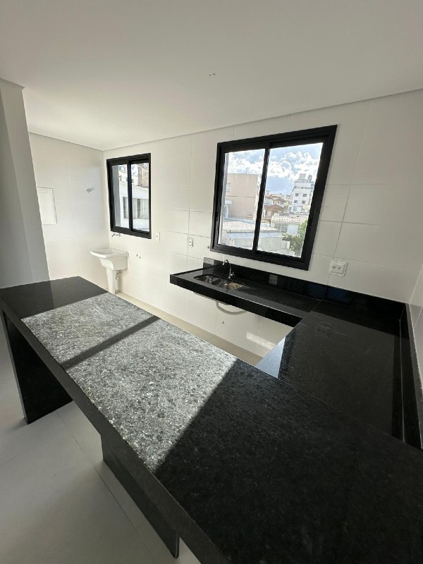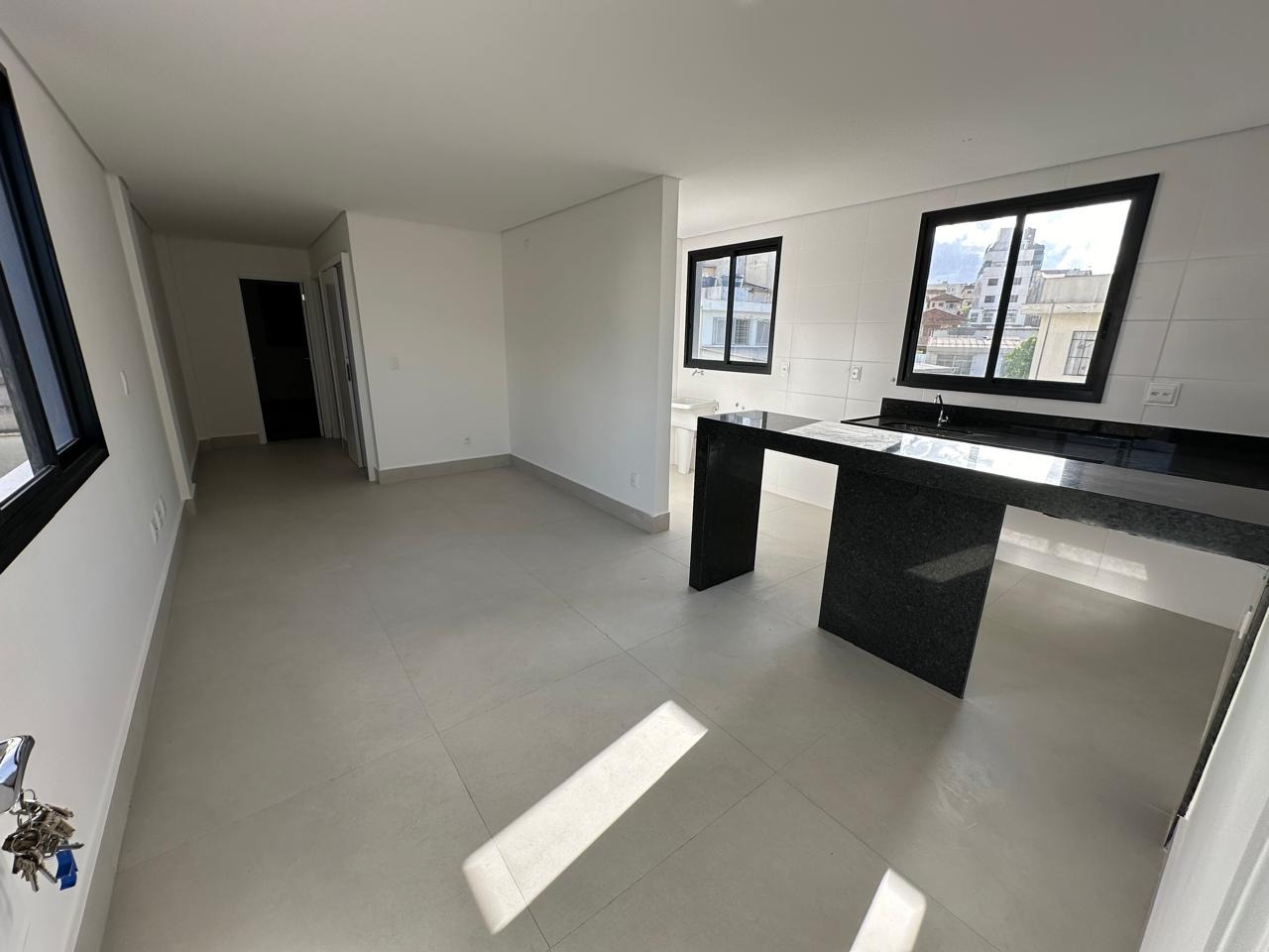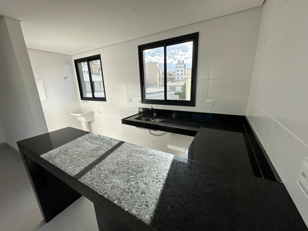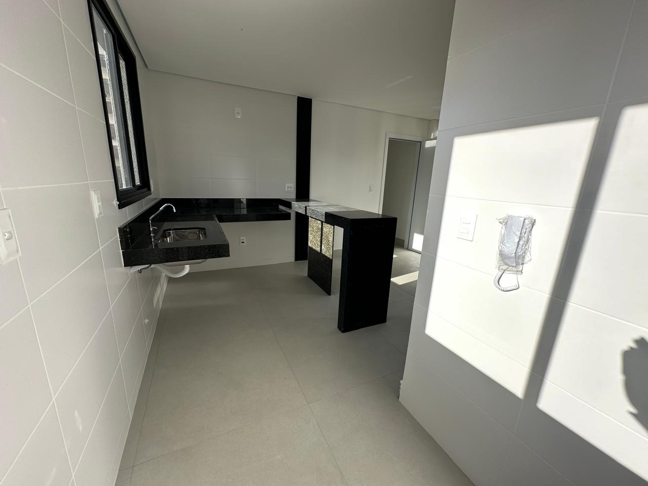 Cozinha tipo americana, bancadas em granito, piso em porcelanato;